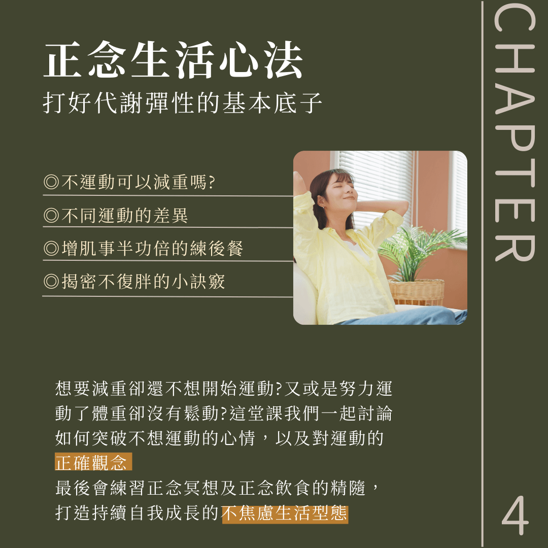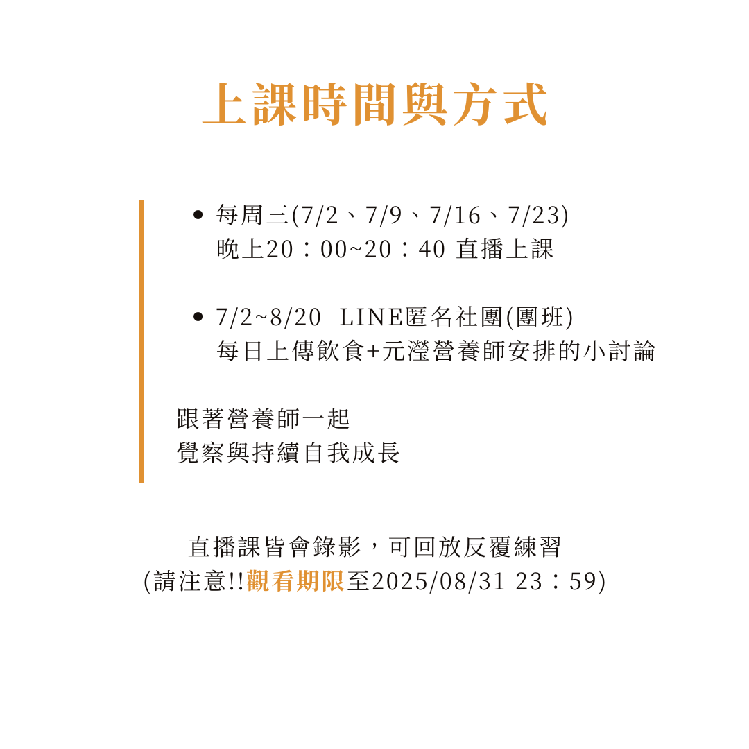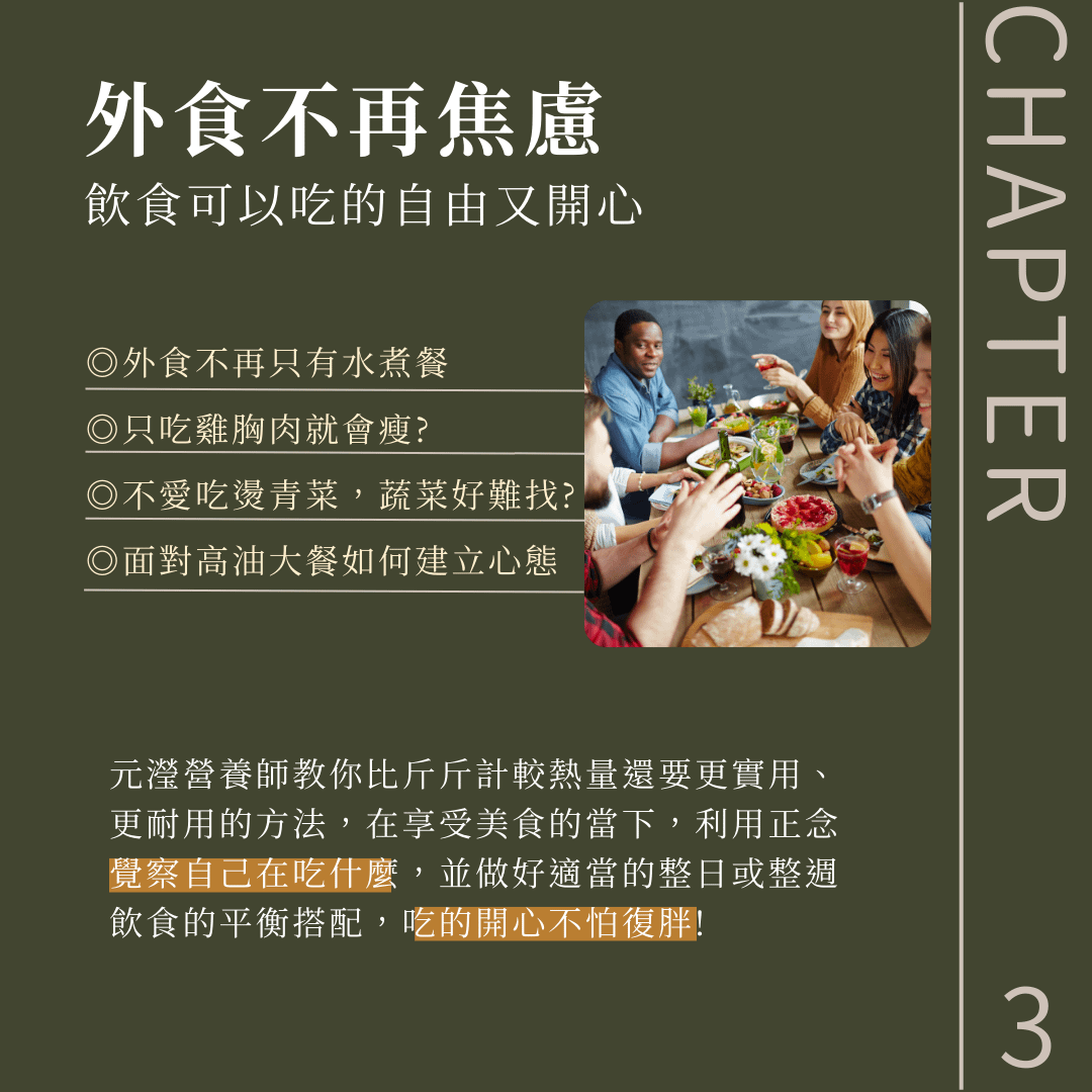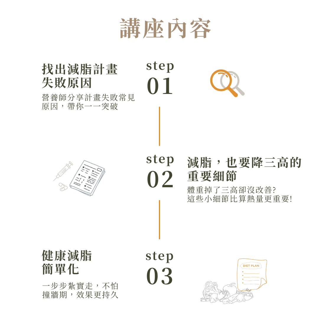 1、健康減脂不復胖 (自煮、外食皆適用):不需背誦各種重量及熱量,營養師會引導你,用簡易的方式輕鬆搭配專屬於自己的健康餐